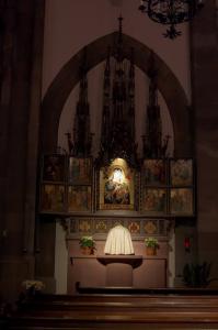 Капитул поручил Файту Вагнеру сделать новый алтарь в 1500 году и определил заранее заданную иконографическую программу. Эти скульптурные картины показались нам особенно интересными. В них реальные исторические события перемешаны с легендами (собственно, алтарь был посвящен жизни святого Матерна, но до наших дней дошло лишь четыре панно). Слева направо изображены следующие сцены:
