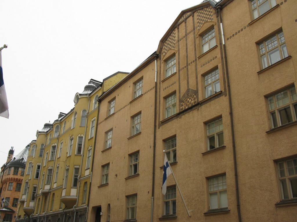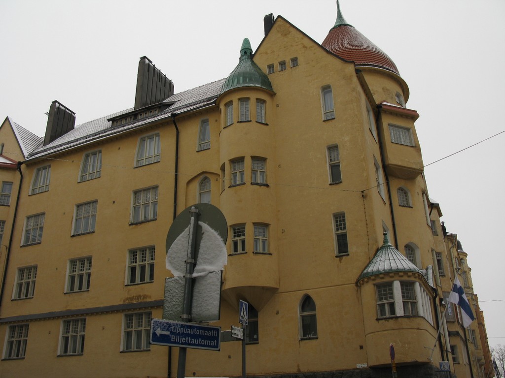 К этому моменту снег, наконец, стих, и мы смогли осмотреть район без особой спешки и вреда для фотоаппарата. Практически сразу за Успенским собором начинается прекрасно сохранившийся квартал с застройкой в стиле финского модерна («национального романтизма»). В основном этот оазис югенда ограничен улицами Satamkatu, Luotsikatu, Kauppiaankatu и Kauppiaankatu. Это так называемая «старая» — западная — часть района Катаянокка, она-то и представляет особый архитектурный интерес, а вот в восточной части Катаянокки длительное время находилась военно-морская база и верфь; там жилые кварталы появились лишь в 1970-х годах.