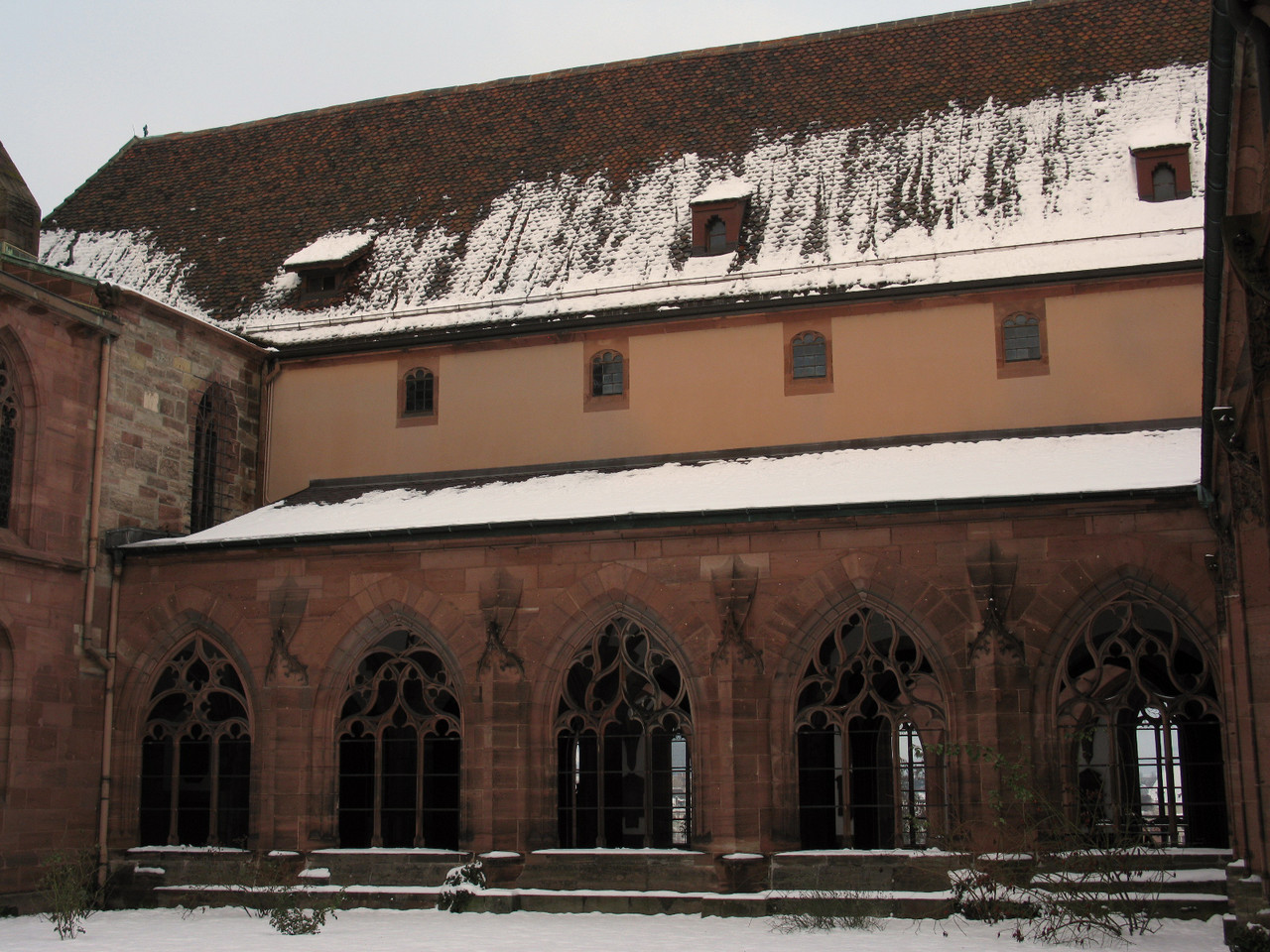 На стене в западном крыле клуатра можно увидеть крупное произведение позднеготического искусства, дошедшее до нас, правда, в довольно ветхом виде. Речь идет о надгробии Вольфганга фон Утенхайма (Wolfgang von Utenheim), скончавшегося в 1501 году. Как гласит надпись, скульптурная композиция в память об усопшем была заказана его дядей, базельским епископом Кристофом фон Утенхаймом. Это многофигурное надгробие с изображением сцены Распятия сильно пострадало во время иконоборческого вандализма в 1529 году и длительное время пролежало под слоем штукатурки; его обнаружили лишь в 1870 году.