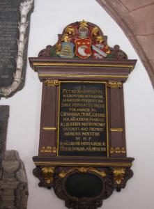 В верхней части памятника можно заметить следы цветной росписи, некогда покрывавшей композицию. Центральную часть памятника занимает эпитафия с латинским текстом и изображением капеллы, где молится коленопреклоненный усопший в рыцарском облачении. На основном поле композиции изображен распятый Иисус и трое солдат, которые бросают жребий, разыгрывая его одежды в кости; слева Христа оплакивают святые жены, Мария Магдалина и апостол Иоанн; справа стоит сотник Лонгин и различные святые. Композицию обрамляет архивольт с фигурами пророков.