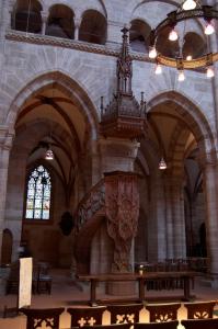 Еще одним ценным предметом интерьера Базельского собора является похожая на кружево ажурная готическая кафедра проповедника, которая была изготовлена в 1486 году предположительно скульптором Гансом Нуссдорфом (Hans Nussdorf). Создается впечатление, будто она вырезана из дерева, но в действительности это красный песчаник. Изогнутая лестница ведет на трибуну, богато украшенную резным орнаментом.