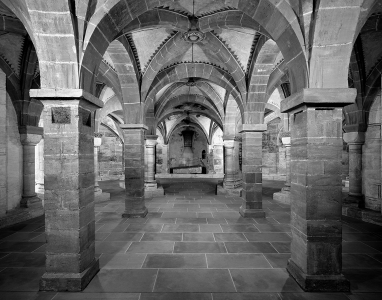 В Базельском соборе две крипты: восточная под алтарной частью и западная под средокрестием. Особый интерес представляет хорошо сохранившаяся восточная крипта, трехнефное помещение с обходной галереей. Галерея и три апсиды крипты относятся к позднероманской эпохе, а трехнефный зал и своды — к более позднему времени, когда собор восстанавливал после землетрясения мастер Иоганн фон Гмюнд. Помимо богослужений и религиозных процессий, крипта использовалась в средние века также как место захоронения базельских епископов. В крипте и сегодня стоит саркофаг епископа Рудольфа, убитого в 917 году при нашествии венгров (источник фото [8]).
