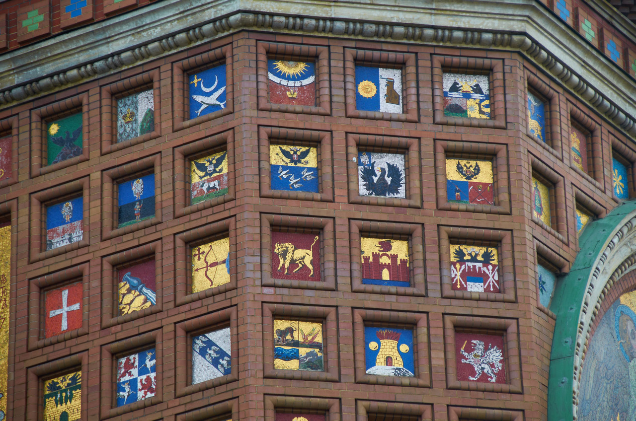 Отличительная особенность колокольни — расположенные в квадратных углублениях с трех сторон ее основания 134 мозаичных герба (по эскизам художника А. П. Черкасова): это гербы всех губерний и областей Российской империи, дополненные некоторыми уездными гербами. Такое оформление наглядно иллюстрировало тему всенародной скорби и покаяния. Гербы были призваны отражать скорбь по императору, «охватившую при роковой вести все сердца на необъятном пространстве общей родины» [20]. Также они свидетельствовали о том, что храм «строила вся Россия» [4] (хотя, как мы теперь знаем, вклад народных пожертвований был гораздо меньше, чем принято считать).