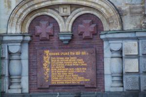 Памятные доски, чередующиеся с блоками серого гранита, помещены с южной, восточной и северной стороны храма.