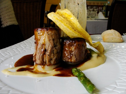 Официантом был очень приятный парень, который приносил нам выбранные блюда и всегда объяснял, из чего они приготовлены - например: карпаччо из телятины с пармезаном. Конечно, объяснял всё на испанском (так что нам было понятно). Блюда немножко „необычные” для меня. Мы все выбрали разные блюда: те, которые хотелось попробовать, – каждый свое. Могу сказать, что было удивительно вкусно и во всех блюдах было соли и специй в меру. Попробовали комбинации соленого со сладким, и всем понравилось. Я сомневалась в этих странных сочетаниях, пока не попробовала.