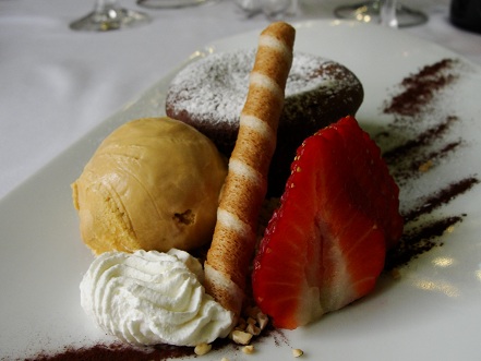 Я взяла ягненка, муж тунца, сын - бифштекс с телятиной, дочка - панированное мясо. Всем всё понравилось и каждое блюдо прекрасно сочеталось с гарниром. Вкусные соусы, холодные закуски и десерты: шейк из сметаны с земляникой, „пудинг” с шоколадом внутри, в сочетании с карамельным мороженым и земляникой - замечательно вкусно.