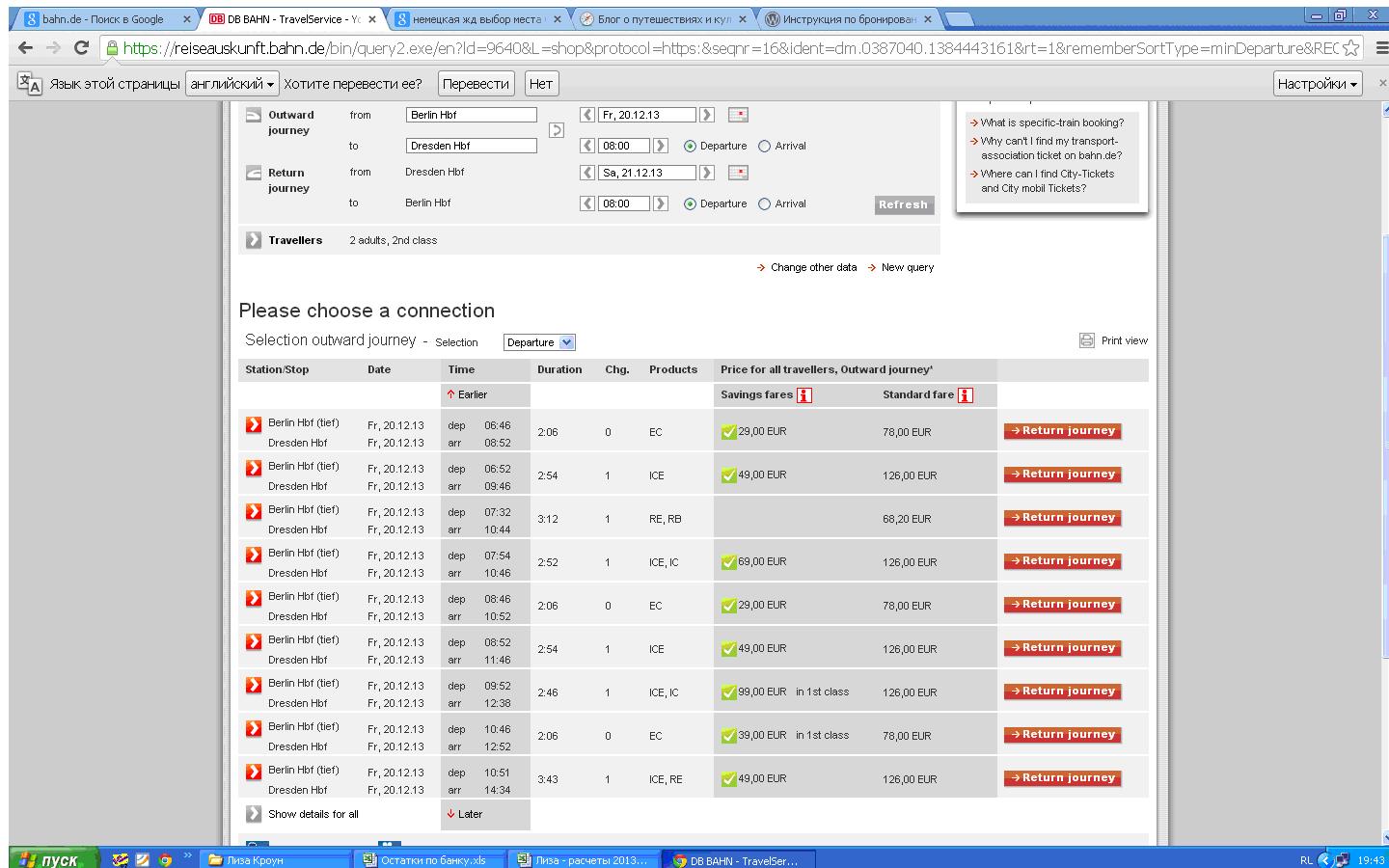 Здравствуйте. Помогите, пожалуйста. Хочу забронировать билеты из Берлина в Дрезден на 20-12-2013, обратно 21-12-2013. Обратный билет бронируется без проблем, а вот с билетом туда не понимаю, в чем дело. Нет кнопки Purchase, уже посмотрела разные даты (+/- 2 дня). С обратными билетами проблем нет. Почему такое может быть?