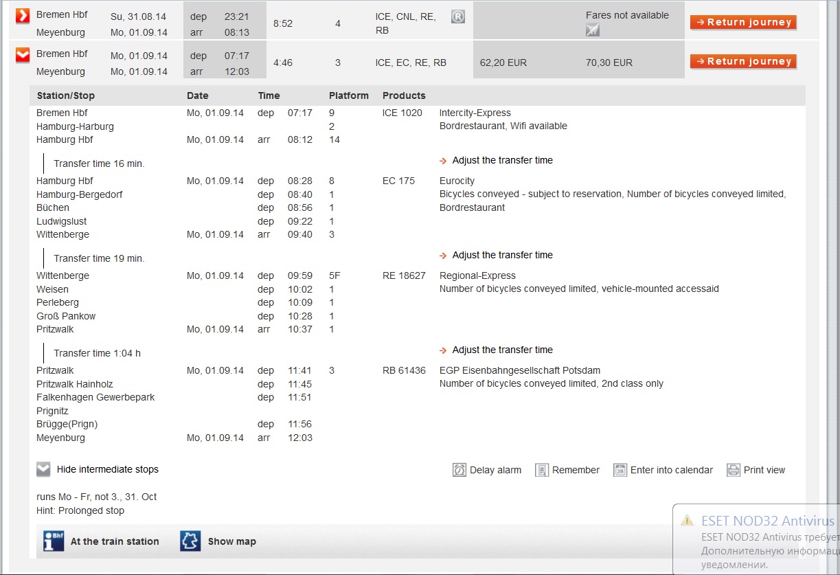 Спасибо за ответ) Меня интересует Берлин - Мюнхен на 05.08.2014 время 19.35 вроде бы, точно не помню! Просто хочу купить заранее билет, чтобы не было потом суеты, так как прилетаем в Берлин в 17.50 и хочется сразу на поезде уехать в Мюнхен!)