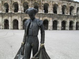 В этот день мы переезжали в Ним. Пошли забрали вещи из номера, попрощались с Фредериком (хозяином гостиницы) и на вокзал. Поезд, как водится, опаздывал, спасибо, всего на 15 мин. Приехали в Ним, заселились в отель. Пошли гулять. От вокзала идет красивый бульвар, по нему прошли до площади с большим фонтаном, а за площадью увидели Арену. Арена Нима стоит на равнине (в отличие от нашей :) в Арле), поэтому кажется невысокой. Вид у Арены аутентичный (впечатление, что ее не чистили с римских времен). Рядом стоит памятник матадору, у которого очень грустный вид, но скульптура хорошая.