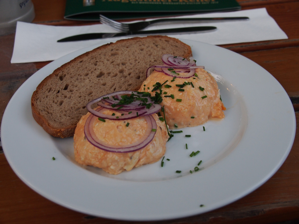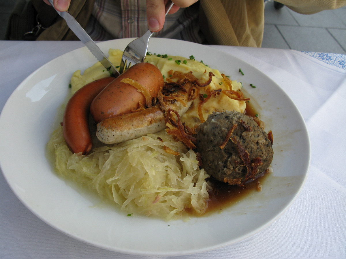 На мой вкус, лучше всего жареные баварские колбаски. Существует множество разновидностей этих колбасок, иногда они входят в состав разных "комбинированных блюд" - хороший вариант, чтобы попробовать сразу несколько видов. Комбинированные блюда могут назваться, например, Brotzeitteller ("обеденная тарелка"; это набор холодных закусок: разного рода колбасы, сосиски, мясо, ветчина, огурчик, хлеб и проч. - на фото) или Wurstsalat ("колбасный салат"; просто колбаса с луком, огурчиком и хлебом - на фото справа) или Käseteller ("сырная тарелка").